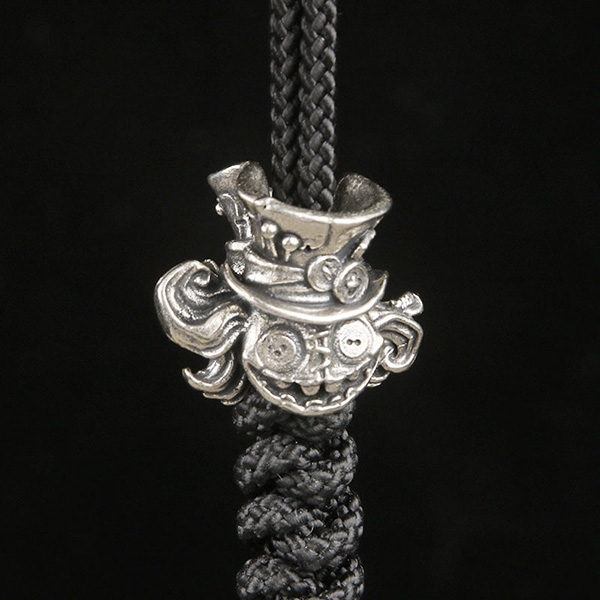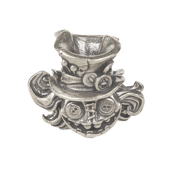 Металева намистина, що зображає голову ляльки або опудала Капелюшника.