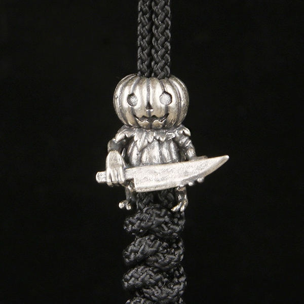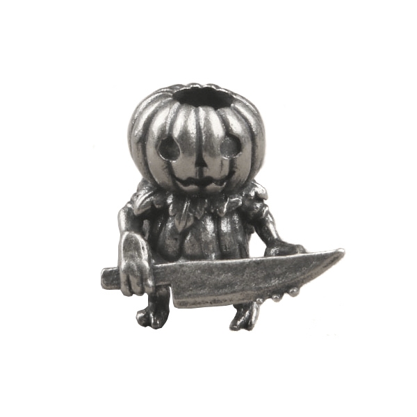 Деталізована намистина у вигляді геловінського демона з головою-гарбузом з ножем в руках та у плащі.