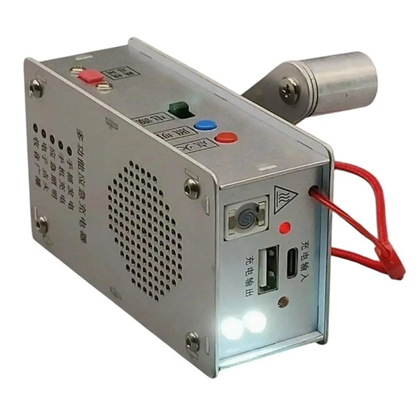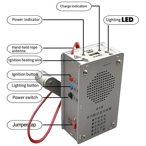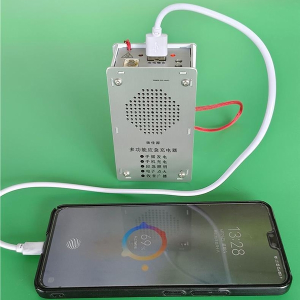 Автономний павербанк в металевому корпусі, призначений для зарядки смартфонів та інших гаджетів. За відсутності мережевої електроенергії може заряджатися від вбудованого генератора, ручка якого виведена назовні. Окрім функції зарядного пристрою, прилад також має вбудований радіоприймач (FM, SW1, SW2), спіраль розжарення для розпалювання вогню та світлодіодний ліхтарик.