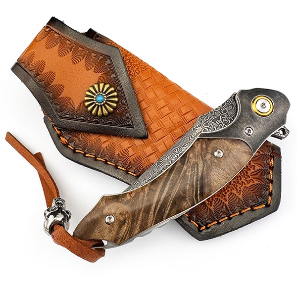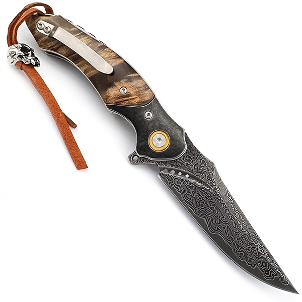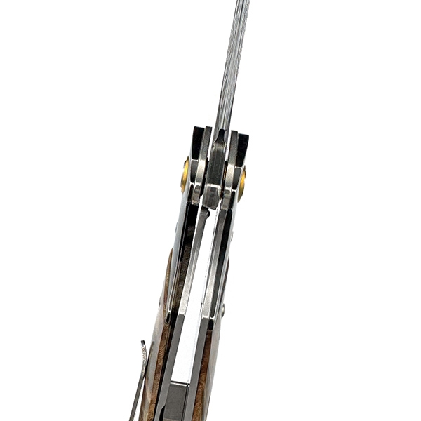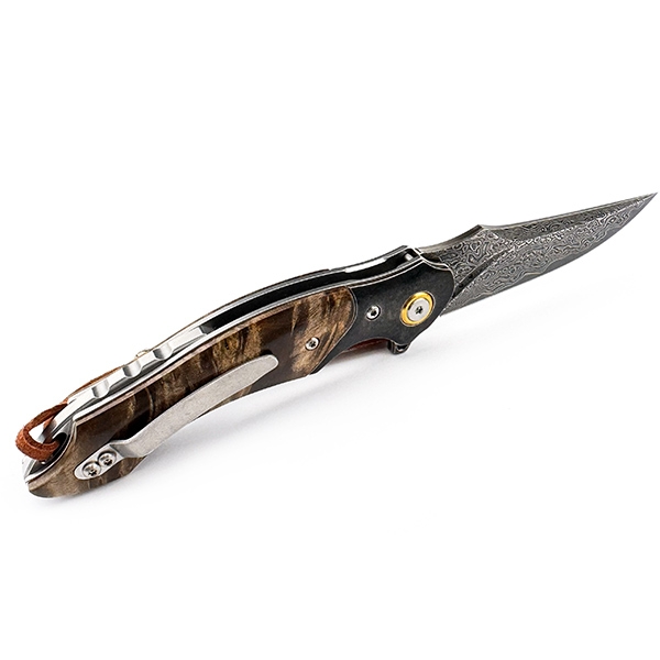 Невеликий фліппер на підшипниках з витонченим руків’ям з дерев’яними накладками та сталевим больстером. Клинок виготовлено з ламінованої багатошарової сталі.