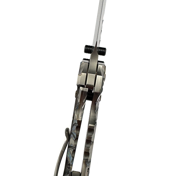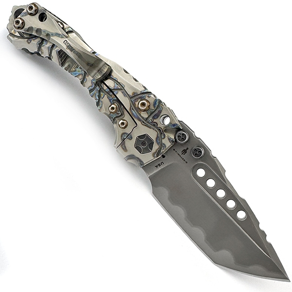 Незважаючи на свою на перший погляд абсолютну непрактичність, репліки кастомного велетня T1 від Miller Bros продовжують з’являтися у все нових варіаціях. Це великий, масивний складний ніж вагою більше 400 грам, що здобув популярність завдяки своєму унікальному брутальному стилю. Дана репліка демонструє кастомні титанові накладки з сегментованим узором та вкрапленнями кольорового анодування. Ніж рясніє величезною кількістю деталей, що перетворюють його на справжній витвір мистецтва – нескінченні лінії, виїмки, подвійні шпеники, кастомні гвинти, втулки під осьовий, дизайнерські різьблення та вибірки – вражаючий зовнішній вигляд чудово поєднується з дорогими матеріалами. Титанове руків’я, клинок зі сталі Z-Wear, бронзова втулка під осьовий гвинт – перелік не менш вражаючий за зовнішній вигляд. Не забули і про сталевий пін, що вставляється крізь руків'я та проходить через клинок - як додатковий захист від випадкового закриття.