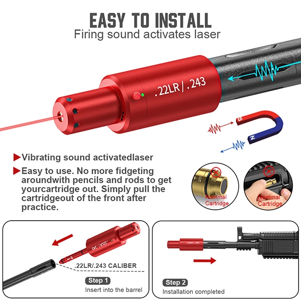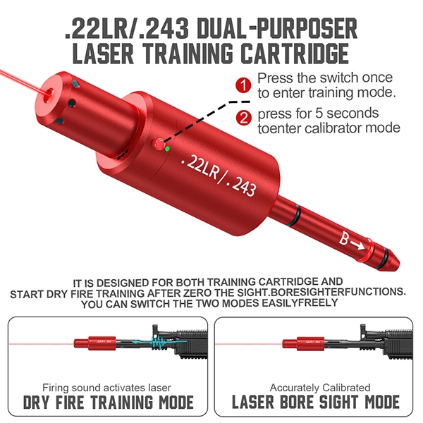 Компактна насадка в алюмінієвому корпусі, що вставляється у дульний зріз ствола малокаліберної гвинтівки або пістолета такого ж калібру (22LR). Завдяки магніту у задній частині, насадка щільно «прилипає» і не випадає при опусканні ствола чи різких рухах. Всередині є чутливий датчик, який реагує на вібрацію, яку створює холостий «клац» спуску УСМ та відзначає її лазерною крапкою у тому місці, куди направлена зброя. Здійснювати такі «постріли» можна за будь-яких умов – на свіжому повітрі чи навіть у квартирі. Це тихо, безпечно, зручно і дає можливість відточити базові навики прицілювання, стрільби з різних положень та ін. У поєднанні з лазерними мішенями така «стрільба» є ще більш реалістичною та ефективною. Окрім тренувальних властивостей, насадка виступає також інструментом для пристрілки та налаштування прицільних засобів. Зателефонуйте нам, щоб купити тренувальну лазерну насадку калібру .22LR.