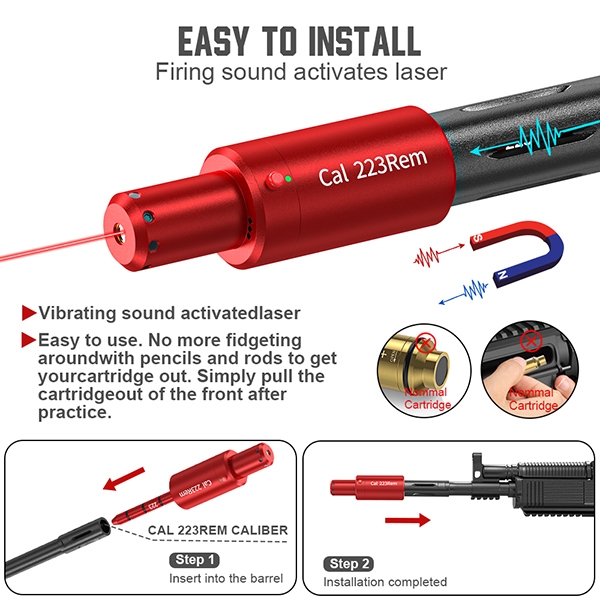 Холостіння зброї є важливим компонентом тренувань, а лазерні патрони, а бо як у цьому випадку насадка – є їх важливою складовою. Насадка легко монтується і не потребує додаткових налаштувань – достатньо вставити стержень у дульний зріз, а вбудований магніт міцно прикріпиться до ствола. Чутливий внутрішній датчик реагує на вібрацію, тож клацання ударно-спускового механізму буде активовувати лазер та відмічати червоною крапкою те місце, куди направлений ствол зброї. Таке тренування можна проводити будь де, навіть вдома. Для більш реалістичної взаємодії можна додати до процесу і лазерну мішень, що реагує на лазерний промінь підстрибуванням або звуковим сигналом. Окрім тренувальних властивостей, насадка виступає також інструментом для пристрілки та налаштування прицільних засобів.
