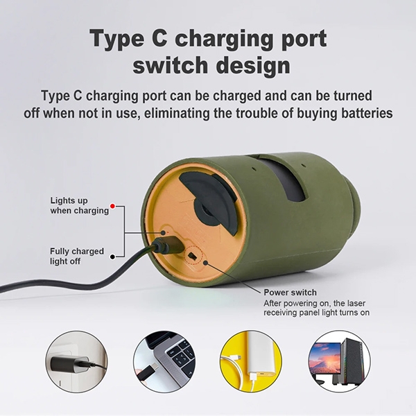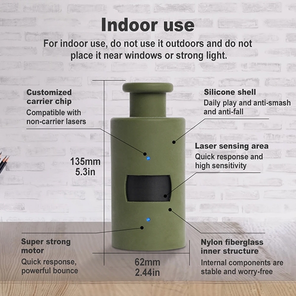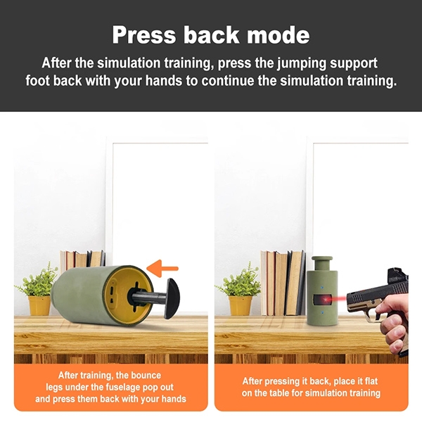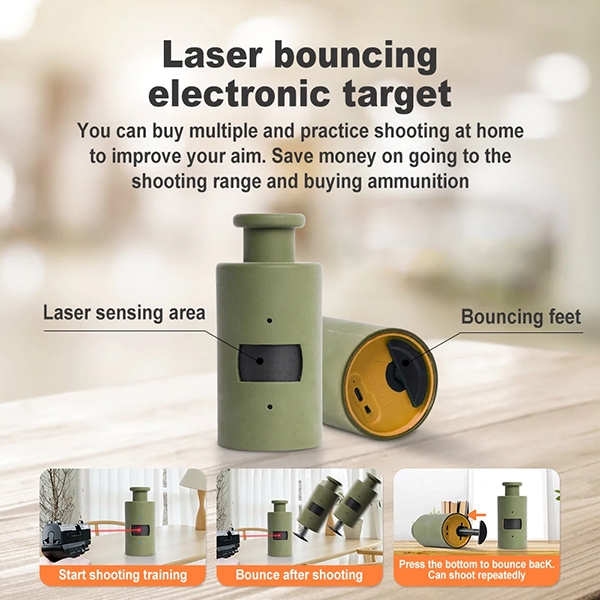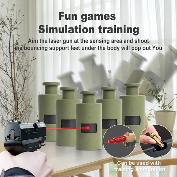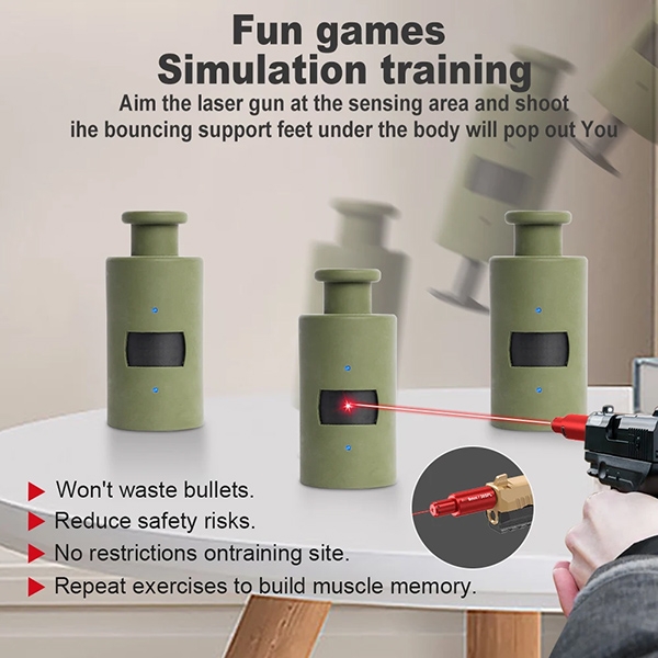 При використанні лазерного патрона чи ствольної насадки для холостіння і тренувань зі зброєю, наявність активної мішені додає процесу кращого «ефекту присутності» та робить тренування більш наглядним та цікавим. Така мішень має чутливий сенсор, який при потраплянні на нього лазерного променя активовує механізм «підстрибування», що примушує її діяти так, начебто у неї влучила справжня куля – підстрибнути і впасти. Корпус мішені обтягнутий спеціальним силіконовим матеріалом, що захищає внутрішній механізм від пошкоджень. Живлення мішені відбувається від вбудованого акумулятора, що заряджається від Type-C кабеля. Мішень спроектована для використання у приміщенні або за відсутності прямого сонячного світла, яке може створювати перешкоди для спрацювання від лазера. Щоб придбати стрибучу тренувальну лазерну мішень, оформіть замовлення на сайті.