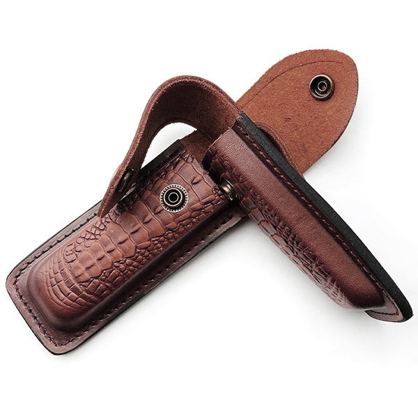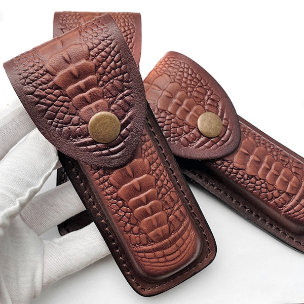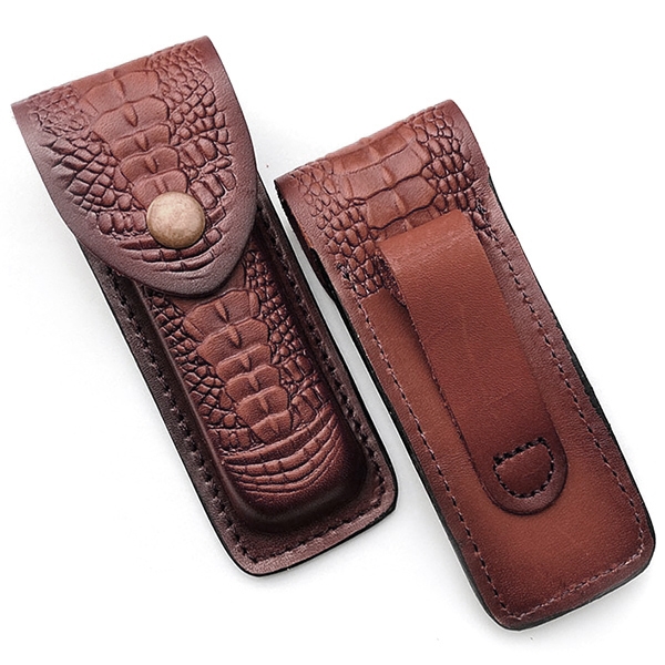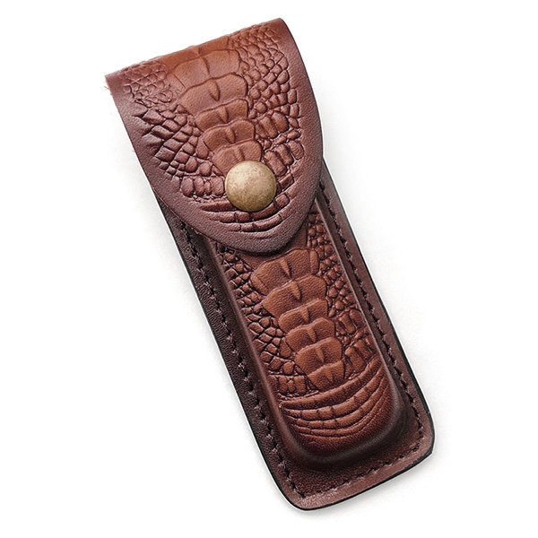 Вузька шкіряна кобура для складного ножа з застібкою-кнопкою і кріпленням на поясний ремінь.