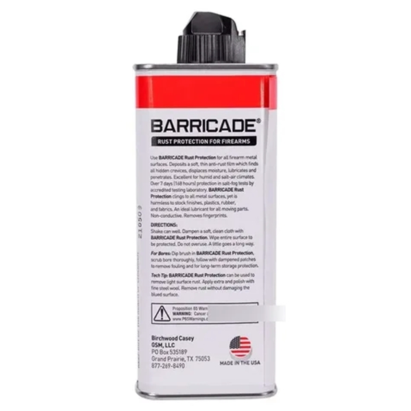 Нанесенная на металл тонким слоем, жидкость для защиты от коррозии Barricade создает тонкую защитную пленку, выталкивая влагу и смазывая поверхность металлических деталей. Лабораторные тесты показывают, что защитная пленка остается целостной и стойкой даже после недели агрессивного влияния соленого тумана (морской климат). Нужная вещь для защиты дорогостоящего оружия от влаги, особенно во время простоя в сейфе или во время использования на открытом влажном воздухе. Эффективно работает как на канале ствола, так и на других металлических частях оружия. Обладает смазывающими свойствами, а также может удалять рыхлую ржавчину с поверхности металла. Чтобы купить жидкость для защиты от коррозии Birchwood Casey Barricade, сформируйте заказ на нашем сайте.